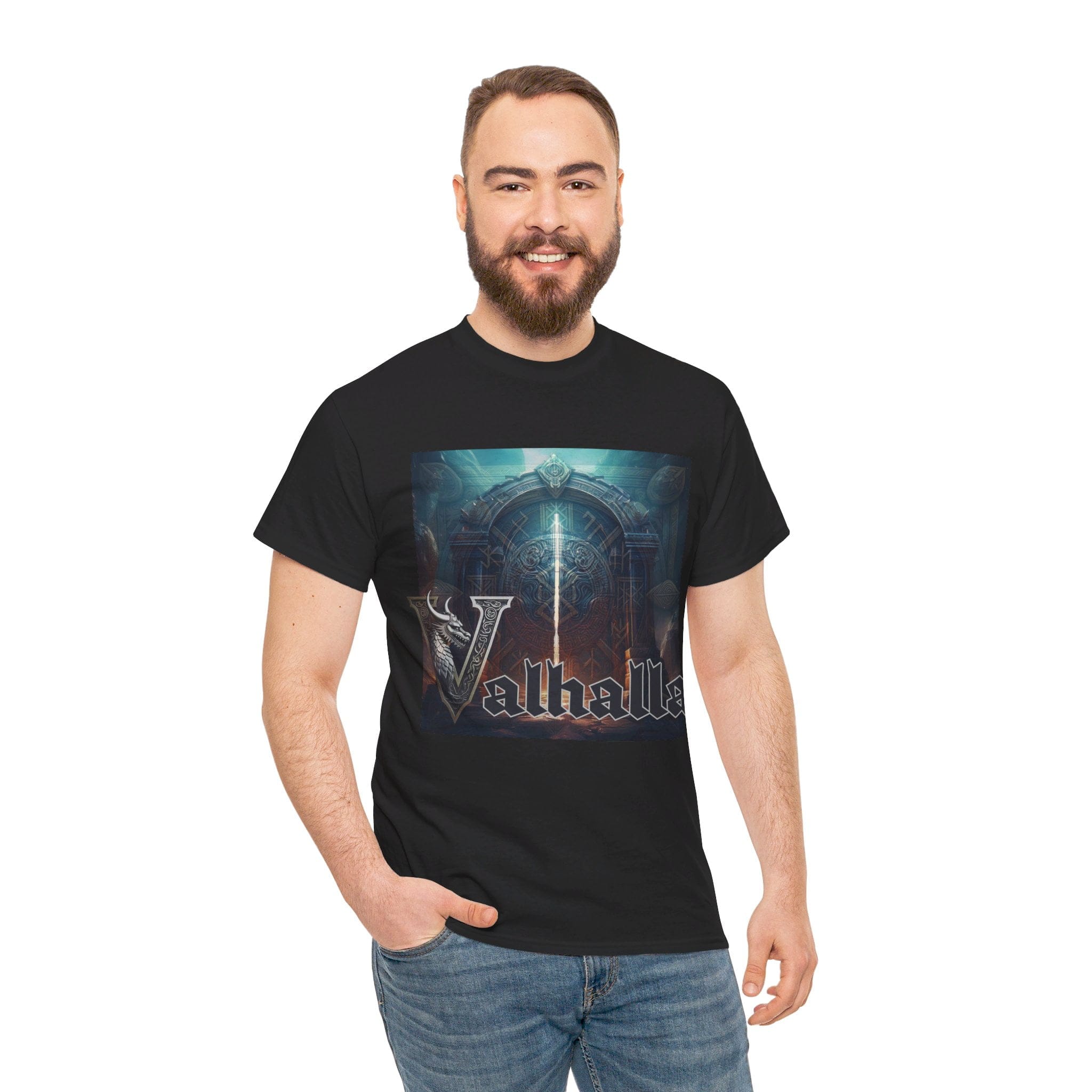 The Doors of Valhalla unisex heavy cotton tee by essantee, is the basic staple of any Viking wardrobe. It is the foundation upon which casual Norse fashion grows. The specially spun fibres provide a smooth surface for premium printing vividity and sharpness. No side seams mean there are no itchy interruptions under the arms. The shoulders have tape for improved durability.